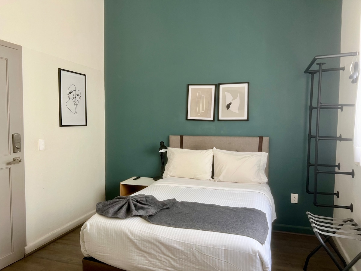 Habitación cómoda con terraza y baño privados dentro del Hostal Nube Mia. Este es un hostal céntrico, recién remodelado frente al parque Rojo en el corazón de Guadalajara. El hostal fue diseñado para que nuestros huéspedes disfruten de estar o trabajar en su espacio; brindamos servicio de limpieza diario. Los huéspedes tienen acceso a una hermosa terraza con vista a la ciudad, y a una sala de estar con tv, comedor y cocina equipada de uso común.