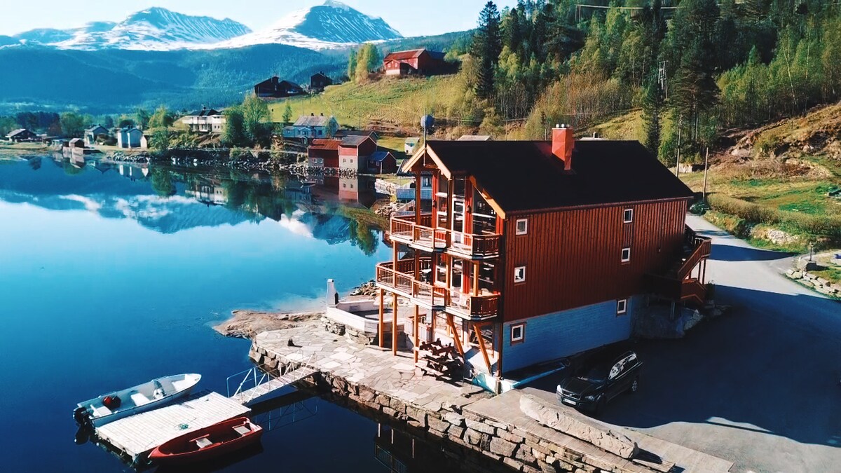 Svetla i moderna vikendica blizu jezera. Veliki panoramski prozori sa fantastičnim pogledom. Kuhinja sa mašinom za pranje sudova. Uz kuću je mali ribarski čamac / čamac za veslanje. Možete pecati ili se kupati odmah ispod vikendice. Đakuzi na drva (korišćenje se mora dogovoriti, 350 NOK za jednokratno korišćenje, zatim 200 po zagrevanju) Daske za veslanje se iznajmljuju za 200 NOK dodatno po boravku po dasci Koliba se nalazi sama na jednom rtu na samom kraju fjorda Surnadal. Prijava je obično od 15.00, ali često je moguće prijaviti se ranije. 20 minuta od alpskog centra Seterlia i staza za skijaško trčanje