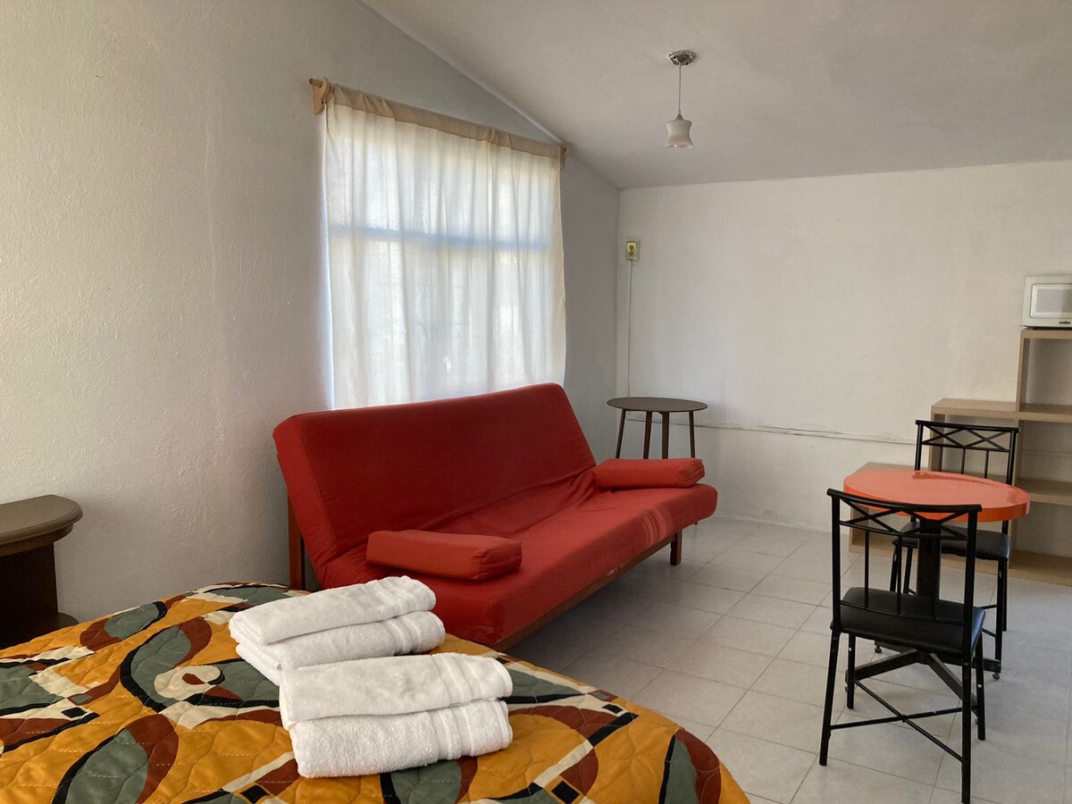 Boutique potkrovlje za 2–3 gosta u Koloniji. Univerzitet, Toluka. Bračni krevet i kauč na razvlačenje, Wi-Fi od 300 Mb i pametni TV. Kuhinja opremljena indukcionim (lonci/tavice) i osnovnim sadržajem: kafa, čaj, šećer, ulje, so i biber. Topla voda je dostupna 24/7, a ako je hladno, obezbijedićemo grejalicu. Parking je uključen za 1 automobil (može da stane veliki kombi, nije natkriven). Prvi sprat (samo stepenice). Mirna ulica i mirni sati. Usluga 24/7.
