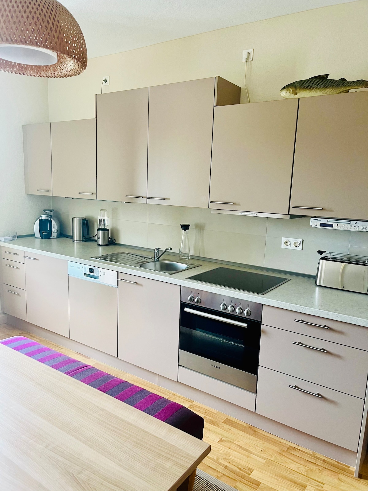 Dobro došli u svoj elegantni gradski apartman u srcu Hildeshajma! Na 95 m2 ćete naći dvije mirne spavaće sobe sa udobnim bračnim krevetima, potpuno opremljenu kuhinju sa trpezarijom i Nespresso aparat za pravi početak dana. Moderan dizajn i pametan raspored čine ga idealnim za porodice, prijatelje ili poslovne putnike. Mirno, ali centralno – sa brzom Wi-Fi mrežom i privatnim parking mjestom.