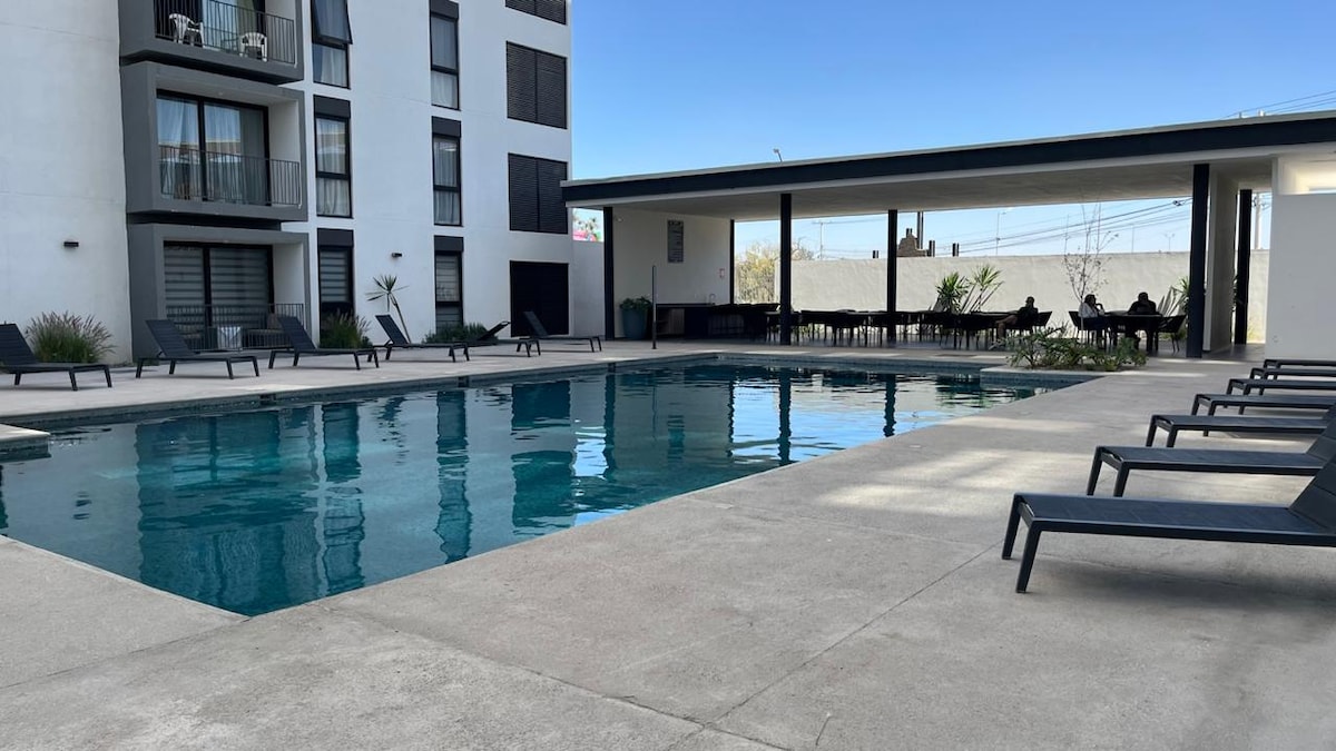 Odličan stan koji se nalazi ispred stadiona Santos Laguna TSM. Okružen restoranima, bolnicama i tržnim centrima (1 minut od Costco-a i HEB-a, praktično pored Walmart-a, 5 minuta od Galerias Laguna i Kongresnog centra. Tokom boravka možete uživati u različitim sadržajima, bazenu, terenu za padel, teretani, zajedničkom prostoru za rad, krovu sa bilijarskim stolom i TV sobom. Rezervišite i učinite svoju posjetu Toreonu prijatnim iskustvom!!