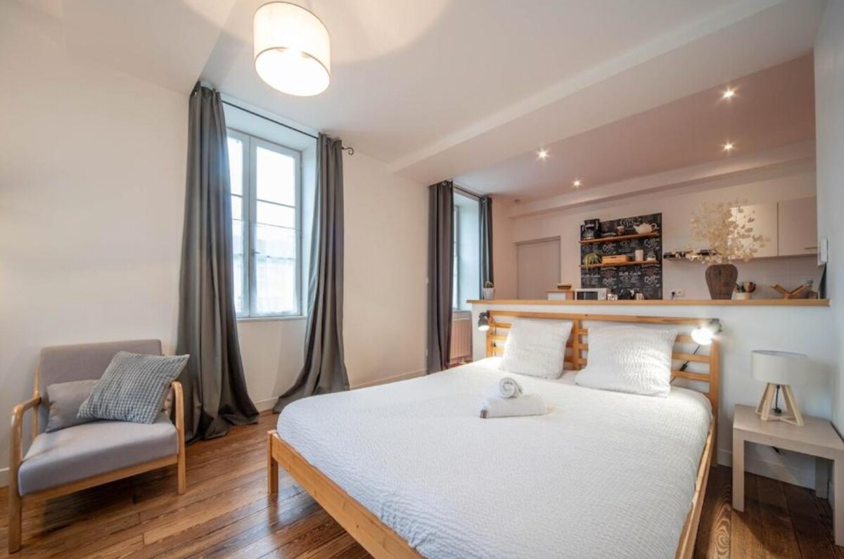Podzemni parking 200m /parking za bicikl je moguć. Dođite i boravite u Chalon-sur-Saône u istorijskom centru u mjestu prepunom istorije koje gleda na Belfry koje je klasifikovano kao istorijski spomenik. Praktično smješten stan od 30 m2 sa zasebnom spavaćom sobom koju je u potpunosti renovirao arhitekta. Zavodiće vas karakter starog sa svojim kamenim zidovima pomešanim sa udobnošću i modernošću potpuno opremljene kuhinje i kupatila sa prirodnim materijalima. Mnogo sadržaja.