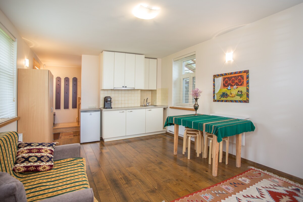 “Trakai Old Town apartment” is in a traditional wooden Karaims house located in the center of Trakai old town, near the Karaims Kenesa (10 m) and Trakai Castle (200 m), Trakai museum (50 m), restaurants, and souvenir shops (100 m). The apartment is surrounded by two lakes: Galvė (50 m) and Totoriškių (50 m). You can enjoy the great view from the windows, relax and explore the beautiful Trakai. The apartment is on the 2nd floor. There are two bedrooms, a kitchen, and one bathroom.