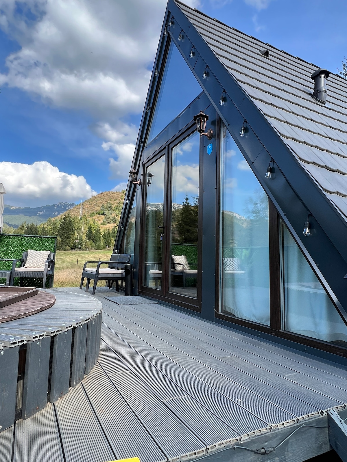 Premium Mountain-Top Retreat in the Apuseni Discover an exclusive cabin set on a secluded mountaintop in the Apuseni, where design, comfort, and breathtaking scenery come together. This stylish retreat features a generous private deck with an outdoor hot tub, refined interiors, and panoramic views in every direction. Perfect for guests seeking luxury, tranquility, and an unforgettable escape above the clouds.