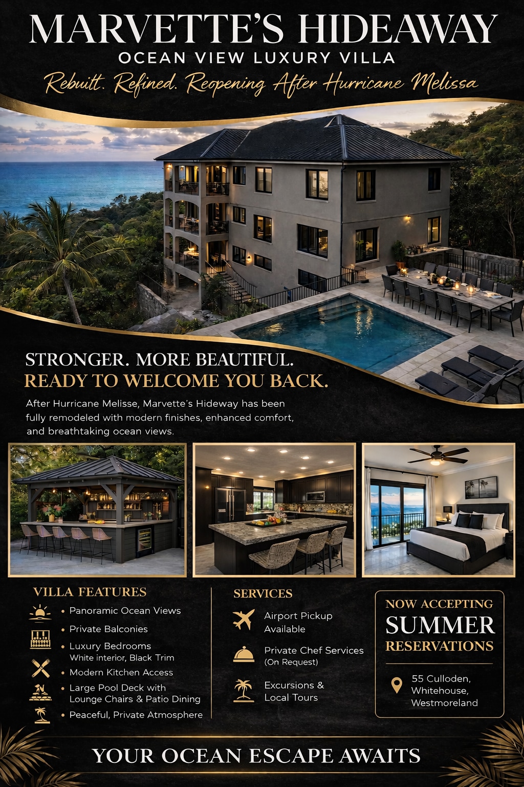 Smeštena na plaži u zalivu Parkers, vila sa 3 spavaće sobe nudi spoljni bazen, hidromasažnu kadu i terasu sa pogledom na okean. Monicove ima besplatan Wi-Fi, potpuno opremljenu kuhinju. Vila Monicove ima moderan dekor, balkon i dnevni boravak sa TV-om ravnog ekrana. Kuhinja ima rernu i mikrotalasnu. Monicove se nalazi 1,5 km od centra Bele kuće. Black River i Ys Falls su udaljeni 30 minuta vožnje, dok su Negril i Montego Bay udaljeni oko sat vremena vožnje.