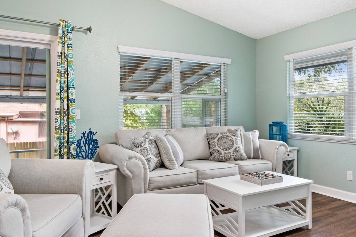 Vibrant 2BR/1Bath home sleeps 8 guests with a magic outdoor space designed to create beautiful memories! Bazen s tropskom morskom vodom i veliki natkriveni prostor za zabavu sa TV-om koji je savršen za opuštanje i uživanje u koktelu. Unutrašnjost je šareno uređena tako da utjelovljuje suštinu odmora! Nalazi se na samo 5 minuta od plaže i 25 minuta do centra grada. Imamo 16 Airbnb smještaja (u porodičnom vlasništvu i u vlasništvu) i posvećeni smo pronalaženju savršenog smještaja za vaše putovanje.