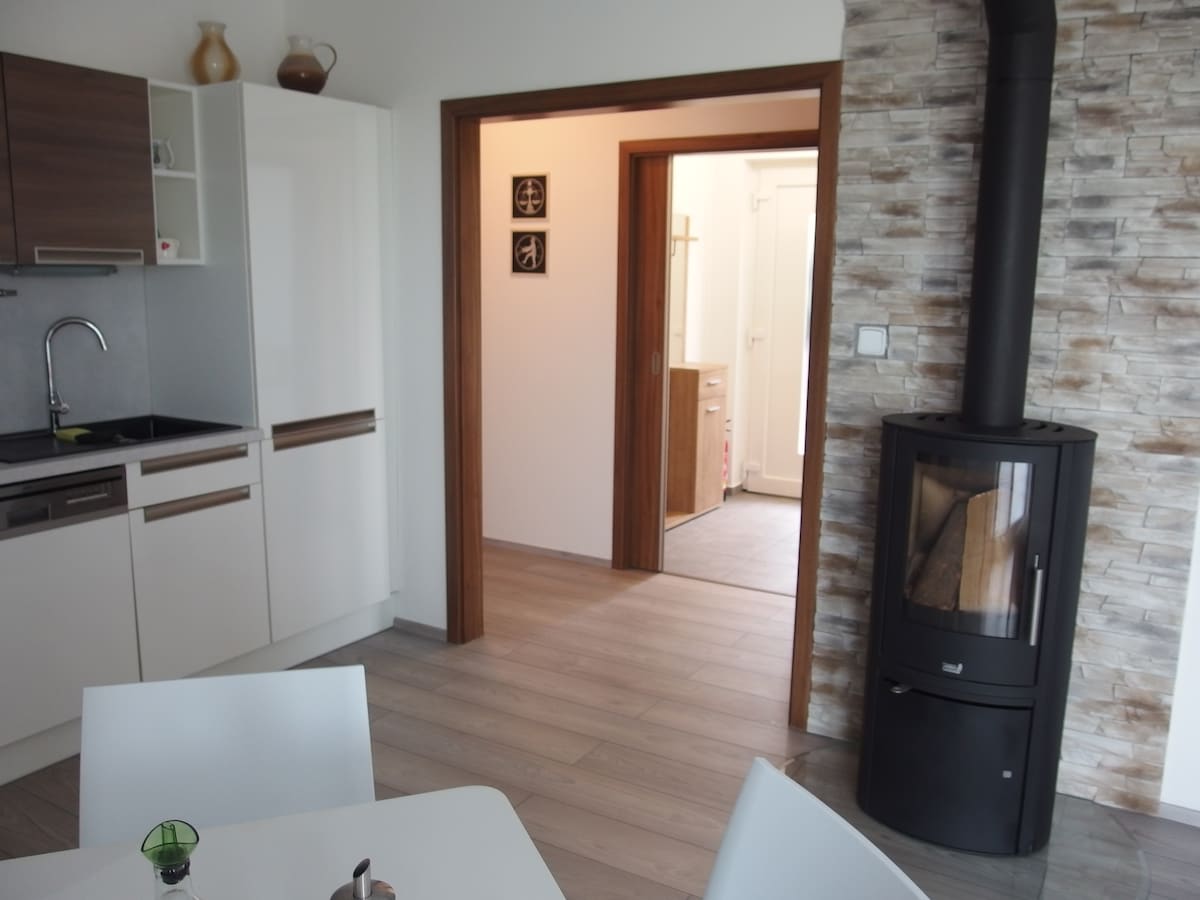 Stan 2+kk u porodičnoj kući sa sopstvenim ulazom u selu Křoví kod Vel.Bíteše, sva oprema i D1 - 5 km. 1 spavaća soba: bračni krevet i krevet za jednu osobu, izuzetno dušek kao pomoćni krevet. Dnevna soba sa TV-om i kaminom povezana sa kuhinjom (mašina za pranje sudova, rerna, mikrotalasna pećnica, frižider sa zamrzivačem, sve posuđe, kuvalo za vodu), trpezarijski sto, 4 stolice, kauč na razvlačenje, ugrađeni ormar u hodniku. Odvojeno kupatilo sa tušem, WC, mašina za pranje veša, umivaonik. Mreže protiv komaraca. Dečija stolica za hranjenje dostupna na zahtev