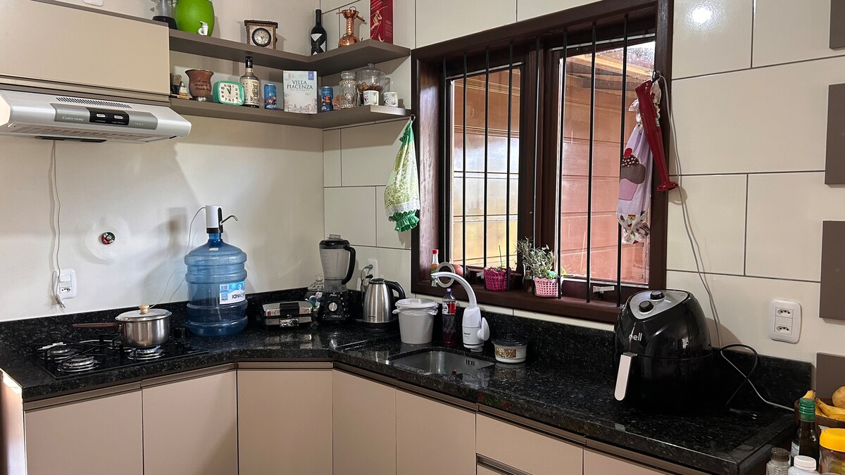 Iznajmite drugi privatni sprat ove lijepe kuće u centru Três de Maio. U blizini gradskog izložbenog sajma. Mezanin/dnevni boravak ima kauč i sto/stolicu za one kojima je potreban prostor za rad. Pristup spavaćoj sobi, kupatilu i balkonu je kroz mezanin, a sve je rezervisano za vas! Pristup sa drugog sprata je stepenicama, u zajedničkom prostoru (u prizemlju živi domaćin, koji će vas dočekati u kući). Kuhinja je zajednička i nalazi se u prizemlju.