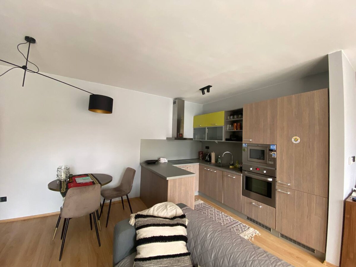 Uživajte u elegantnom doživljaju u ovom smještaju u centru grada, pogodnom za kraća putovanja, kao i za duža poslovna putovanja. Stan ima potpuno opremljenu kuhinju, bračni krevet, kauč i balkon sa lijepim pogledom na mirni unutrašnji blok ove novoizgrađene stambene zgrade. Stan nema dostupno parking mjesto, ali se možete lako kretati gradom pješke, zajedničkim biciklima ili javnim prevozom jer se u blizini stana nalaze autobuske i tramvajske stanice.