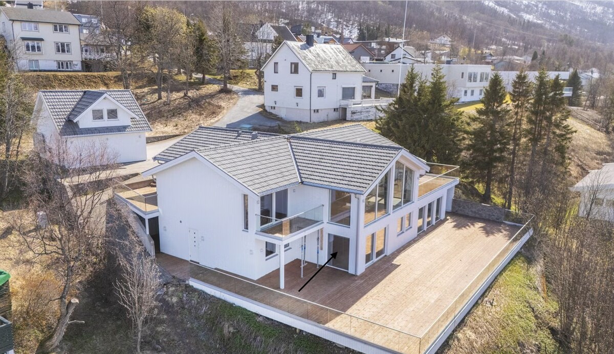 Spektakularna novoizgrađena kuća (2018.) u divnom, mirnom području sa prelijepim pogledom na fjord/more, planine i šumu u Kvaliji /Tromsu. Možete da posmatrate prelijepu sjevernu svjetlost / polarnu svjetlost sa ogromnog prozora (10 m2), sjedeći u dnevnoj sobi sa šoljicom čaja ili kafe u ruci:-) Ovo je savršeno mjesto za turiste koji žele da vide sjeverno svjetlo, kitove u fjordu zimi, planinarenje/ skijanje u planinama ili sve ostalo što želite u ovom divnom gradu.
