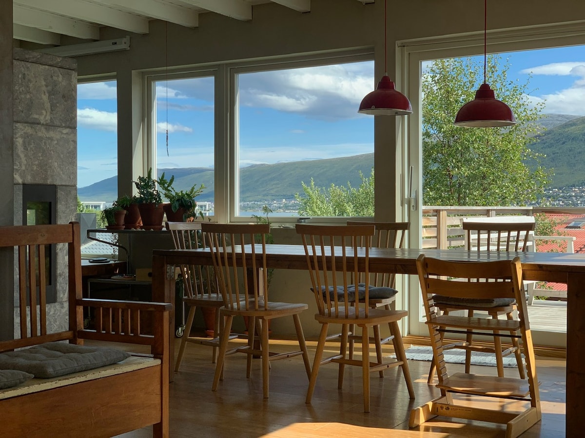 Kuća na tri sprata sa ogromnim prozorima koji lebde iznad grada. ( ima banju u turskoj sauni) Krovna terasa pruža vam pogled od 360 stepeni na sve okolne planine. Štaviše, savršen je uslov da se noću divite polarnoj svjetlosti. Kuća se nalazi 1,2 km od centra Tromsa, autobusi od do kuće (5 minuta do centra). ima 2 spavaće sobe na 1 spratu (4ppl) i veliki kauč (spavanje) u dnevnom boravku na 2. spratu. 3. sprat je mašina za pranje veša i mašina za sušenje veša sa ulazom u terasu. Jedinstveni drveni stil, 70 m2
