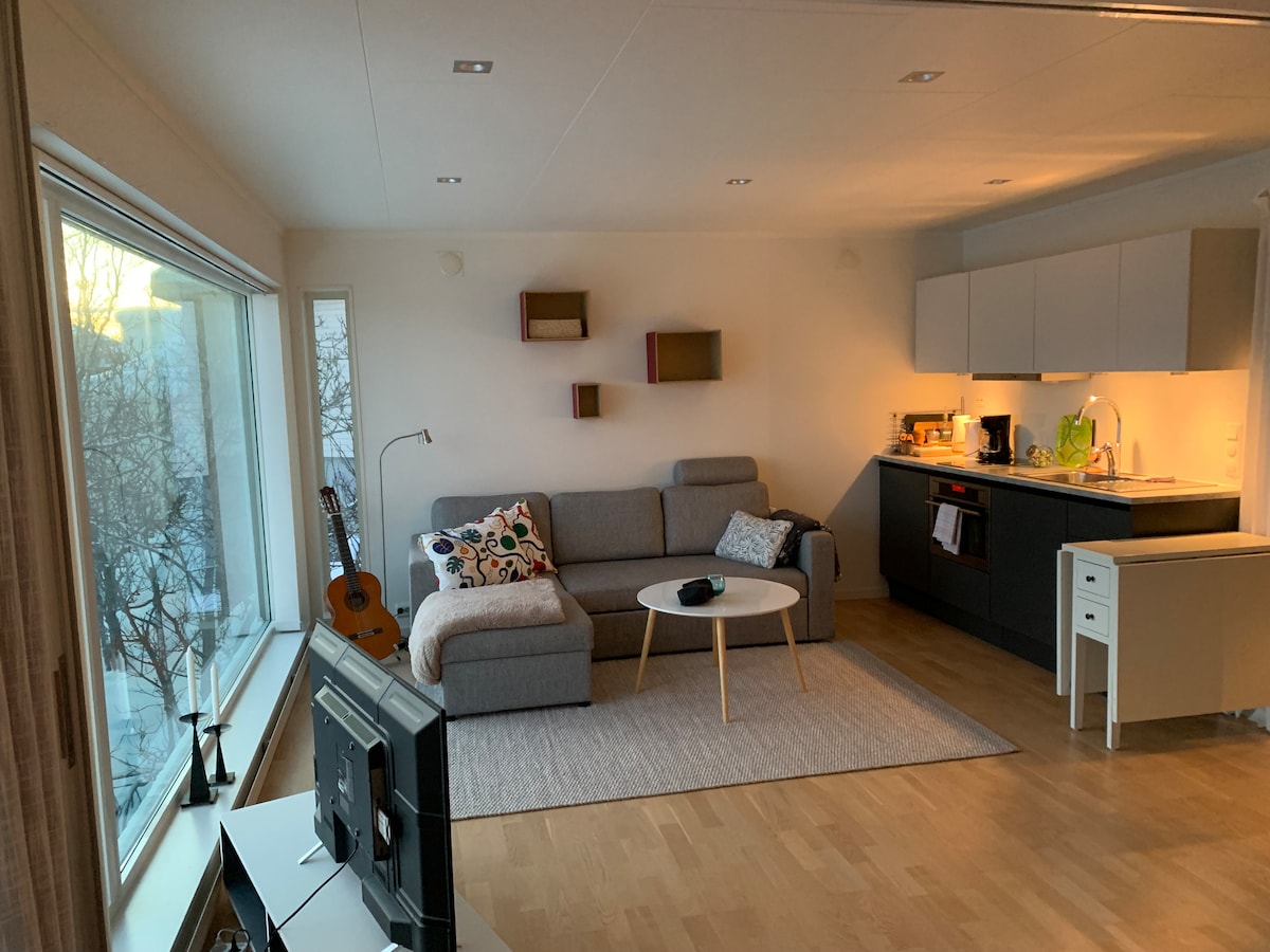 Uživajte u blizini prirode i napunite baterije u ovom jedinstvenom i mirnom smještaju. Udoban stan s balkonom i izuzetno dobrim pogledom. Stan je svijetao i privlačan, a ima i kamin za dodatnu udobnost. Kuhinja je potpuno opremljena, uključujući aparat za kafu. Dnevni boravak ima velike prozore. 2 spavaće sobe sa bračnim krevetom i jedan vazdušni krevet. Veliko kupatilo sa tušem i mašinom za pranje veša. Parking za 1 automobil odmah ispred. Područje je prikladno za djecu i blizu je lijepih planinarskih područja. Kratka šetnja do prodavnice (5 minuta) i autobusa (1 min).