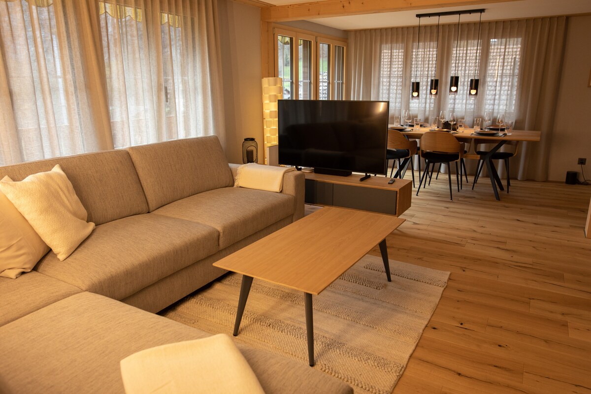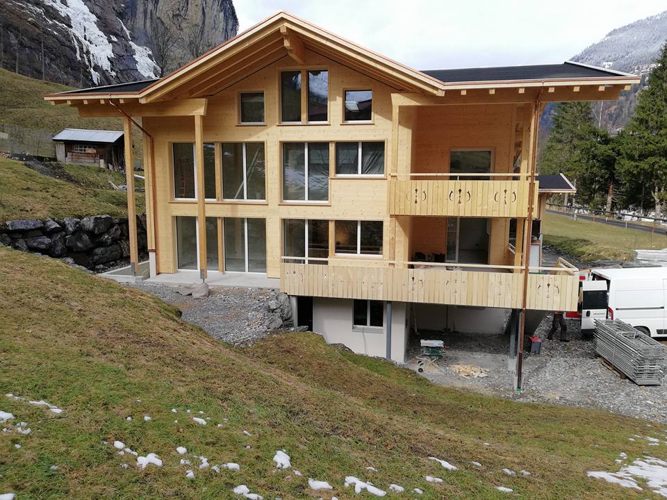 Naš stan se zove Trummelbach. Nalazi se u dolini Lauterbrunnen, odmah pored najviših vodopada Alpa. Lauterbrunnen je deo regiona Jngfrau. Okružena je poznatim planinama Jungfrau, Ajger i Šilthorn. Bićete u prizemlju švajcarske planinske kuće na 3 sprata. Sa ogromne privatne terase, okrenute ka jugu, možete da uživate u najspektakularnijem pogledu na švajcarske planine i da ćete čuti samo krava, ovce i ptice koje pevaju.