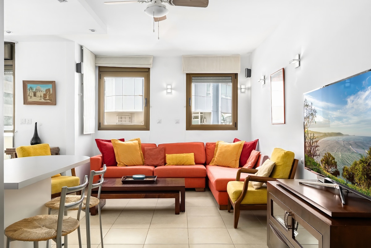 Uživajte u prelijepim TLV zalascima sunca sa sopstvenog balkona. Jasan pogled na plažu. Odmah pored najskupljeg TLV hotela. Uživajte u opuštajućoj energiji mora i zabavite se na plaži preko puta. 2 dnevne sobe, 2 spavaće sobe, 2 tuš-kabine/kupatila, mašina za pranje/sušenje veša, velika kuhinja i trpezarija, privet parking, samo stan na vašem (5) spratu. Do prodavnica i restorana se stiže peške, u centru grada. Savršena kuća za odmor za vas i porodicu da uživate u sjajnom TLV stilu života na plaži:)