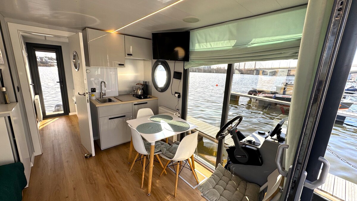 Domek zacumowany jest naprzeciwko małej mariny, która znajduje się w wiosce na 275 kilometrze rzeki Odry w miejscowości Uraz, 20km od Wrocławia. Marina jest cicha, spokojna. W marinie znajduje się pizzeria, smażalnia ryb i bar z widokiem na wodę. W cenie wynajmu jest łódka wiosłowa lub kajak z małym silnikiem elektrycznym do komunikacji z lądem. Ważne!! Nie ma dostępu od strony lądu. Zameldowanie łodzią motorową lub kajakiem.
