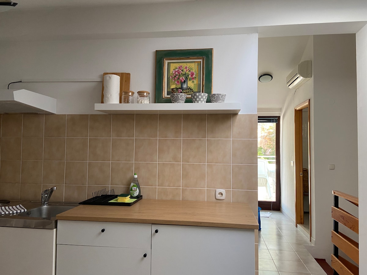 Potpuno novi stan u potkrovlju koji se sastoji od velike kuhinje sa trpezarijom,dvije spavaće sobe, dva kupatila,vešernice i balkona gdje možete uživati u prekrasnom pogledu na more i Paklenska ostrva. Imamo na raspolaganju besplatno parking mjesto ispred kuće. Kuća se nalazi u mirnoj zoni ,ali vrlo blizu svih sadržaja. Centar je udaljen samo 10 minuta od kuće i 5 minuta do prve plaže,supermarketa i restorana.