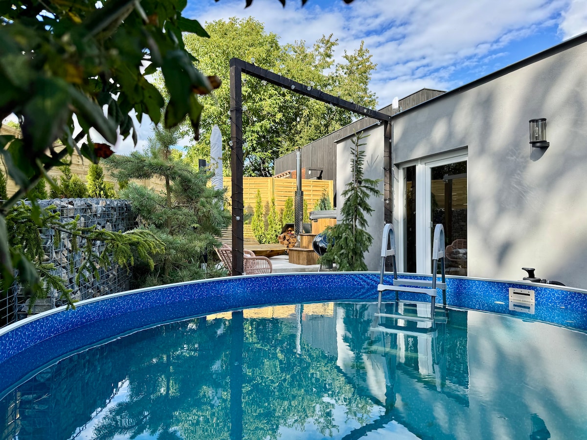 Pobjegnite u ukusno renoviranu istorijsku brvnaru. Zagrijte se u sauni na drva, a zatim se rashladite u prirodnom jezeru. Uživajte u zvuku vodopada, šume i prirode. Opustite se pored prozora uz pucketanje vatre. Luksuzna udobnost uključuje zvučni sistem Bowers & Wilkins, potpuno opremljenu kuhinju recikliranu od starih drvenih vrata i kupatilo sa grijanim podovima i tuš kabinom. Savršeno za romantični boravak ili rad na daljinu sa Dell monitorom na izvlačenje. Samo 30 minuta od Praga.