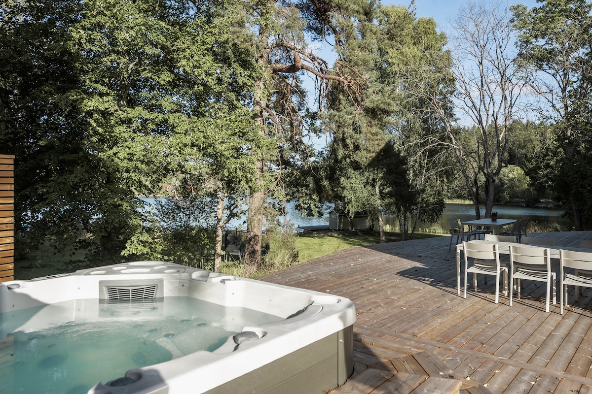 Ett boende med fantastiskt läge vid havet endast 10 meter från vattnet. Med utsikt över Stockholms inlopp ser du båtar och fartyg passera utanför huset som har en terass mot havet. Stugan ligger endast 12 km från centrala Stockholm och ligger avskilt från huvudbyggnaden där vi själva bor. Naturreservat för promenader och löpning ligger ett stenkast från stugan. Den vedeldade badtunnan som står på vår brygga går att hyra för en kväll. För tillfället under reparation. Tillgänglig från 15/5.