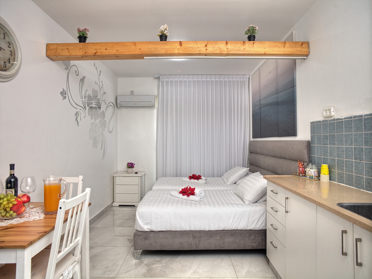 U uličicama starog grada, nekoliko minuta hoda od restorana, prodavnica i sinagoga nalazi se dupli butik apartman sa hidromasažnom kadom za maženje, jevrejskim bračnim krevetom, kuhinjom, trpezarijom i prostranim prostorima za sjedenje. Prostor za spavanje izgrađen je od drevnog autentičnog Safed kamena, tačne kombinacije modernog i antičkog. Jedinstven doživljaj
