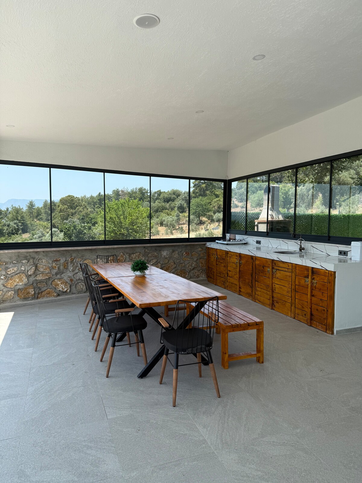 Pobjegnite u ovu luksuznu vilu smještenu u privatnom vrtu od 5000 m2 s bazenom, širokim trijemom i elegantnim unutrašnjim i spoljašnjim prostorom za objedovanje. Uz 3 spavaće sobe, prostrane dnevne boravke i udobnu peć na drva, smještaj je jednako privlačan u jesen i zimu kao i ljeti. Okružena pticama, leptirima i seoskim životom, vila nudi mir i privatnost. A kada budete spremni za istraživanje, plaža Akjaka (11,5 km), Akčapinar (11,3 km) i plaža za kajting (13,4 km) udaljeni su samo nekoliko minuta vožnje.