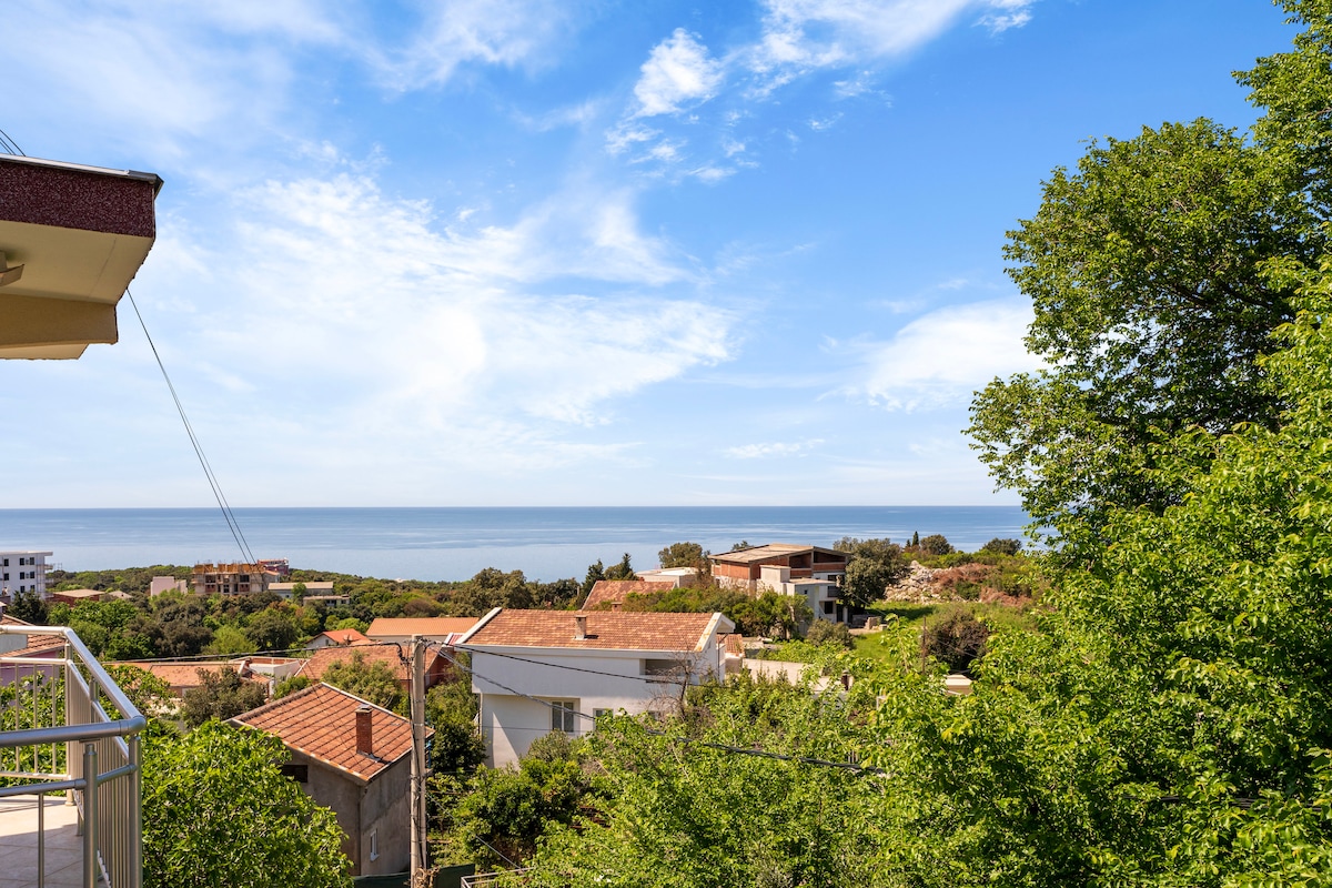 Dvosoban stan sa kuhinjom, velikom terasom i pogledom na more. Mnogo zelenila, bašta i unutrašnje dvorište. Čista i uredna, čista posteljina, redovno čišćenje. Brzi Wi-Fi i kablovski internet. Mirno mjesto s čistim plažama, blizu mora. Parking do kuće. Samo vi na podu. Sva vaša pitanja su dobrodošla! Drago mi je što vas vidim!
