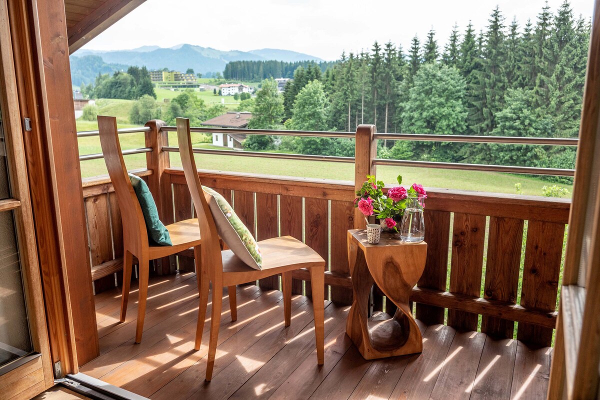U apartmanu Junior sa kategorijom pogleda na planine, naći ćete stan od preko 30 m2 za najviše tri osobe sa bračnim krevetom i visokokvalitetnim kaučem na razvlačenje. Stan ima potpuno opremljenu kuhinju sa udobnim prostorom za sedenje, luksuzno kupatilo sa ogromnom tuš kabinom i mašinom za pranje i sušenje veša i terasu od 10 m² sa dovoljno mesta za doručak na otvorenom sa zadivljujućim pogledom na tirolske planine.
