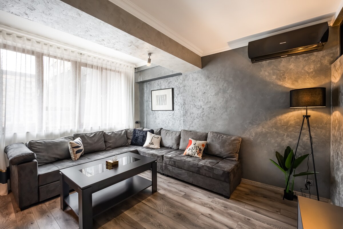 Živite 2 minuta od Trga Republike. Luxe na gornjem spratu 1BR sa zadivljujućim panoramskim pogledom. Uživajte u modernom enterijeru, TV-u od55 ", IPTV-u, Wi-Fi mreži i najsavremenijim uređajima, uključujući podno grijanje za udobnost tokom cijele godine. Na samo nekoliko koraka pronađite supermarkete, mjenjačnicu, apoteku, piceriju, kasnonoćnu prodavnicu hrane i igara i skybar za noćni život. Park je odmah ispred, a ekskluzivni pristup liftu za gornja dva sprata osigurava privatnost i bez čekanja. Luksuzni život s vrhunskom praktičnošću!