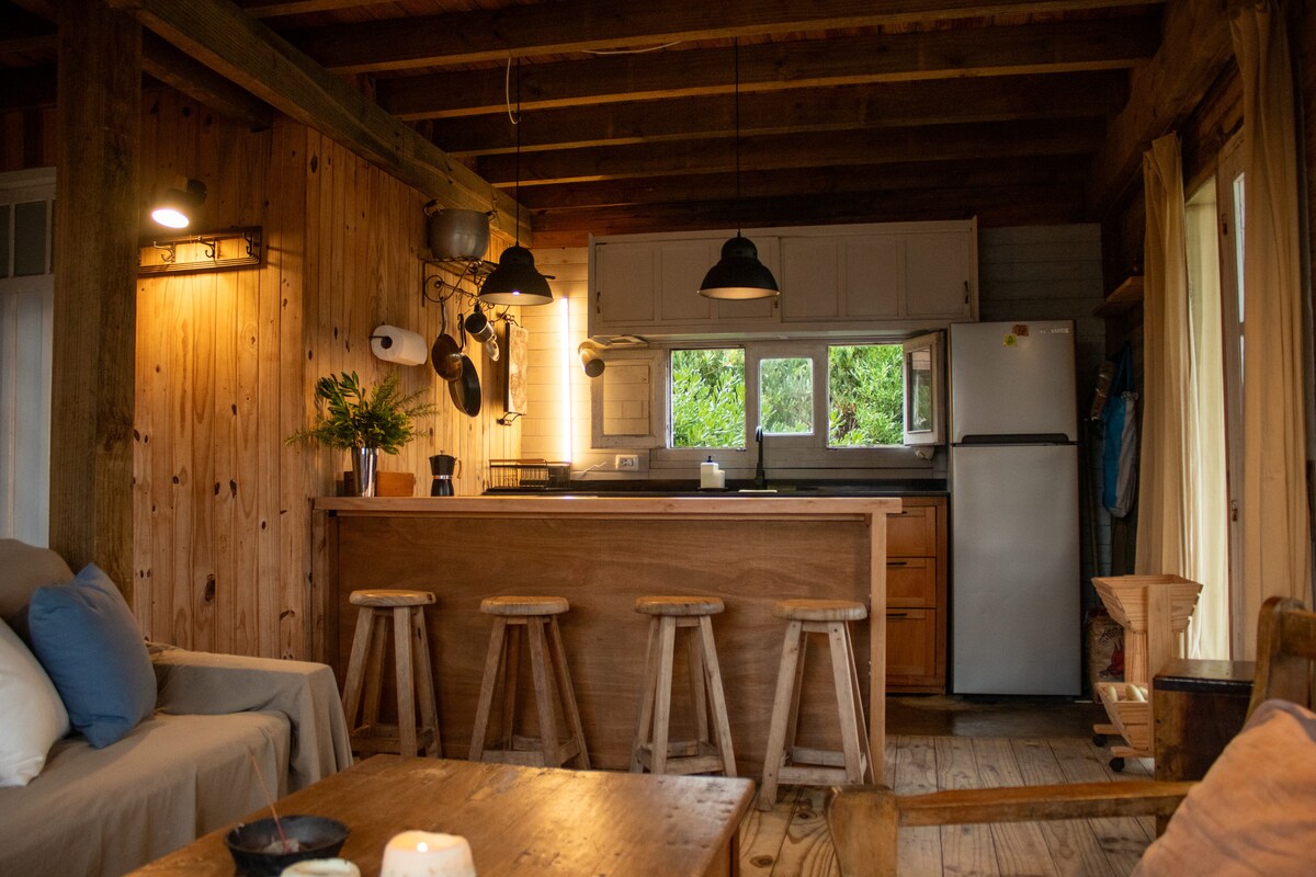 Topla drvena kuća na dva sprata iznad plaže u Punta Rubiji, mirna četvrt iznad dina i metara od mora. La Pedrera je udaljen 1 km i Kabo Polonio 37 km. Obećana plaža! Kuća ima PB sa dnevnom sobom i integrisanom kuhinjom i kupatilom. U Pensilvaniji, 2 spavaće sobe. Jedan sa bračnim krevetom, sa pristupom terasi koja se vidi na fotografiji, a druga sa dva jednostavna kreveta i foteljama. Postoji i mogućnost pretvaranja u krevet, naslonjač.Outdoorarray. Uživajte!