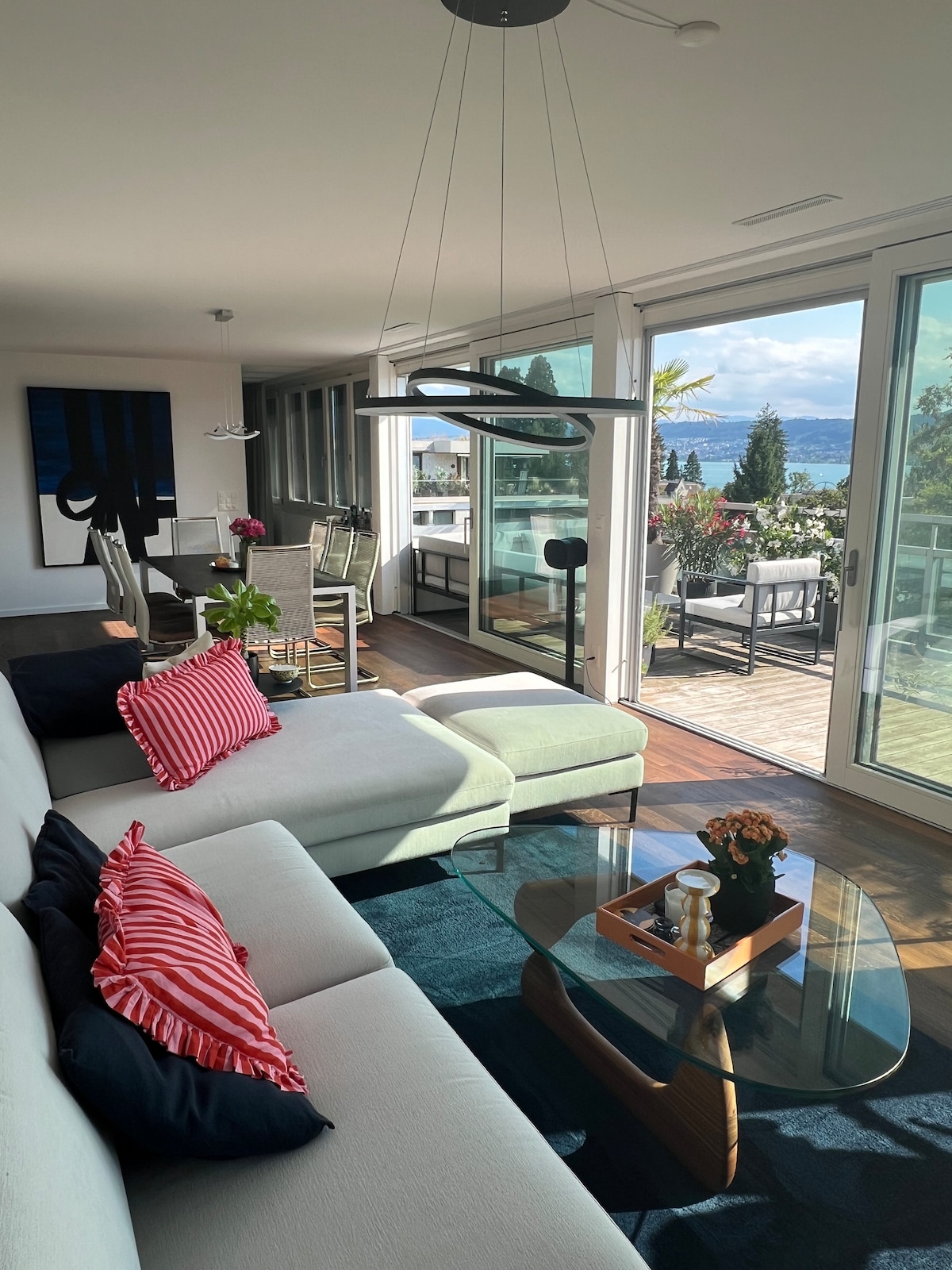 Svetli penthaus sa predivnim pogledom na jezero na zlatnoj obali Ciriha. Prostrani dnevni boravak sa kaminom, TV-om i velikom terasom za zalaske sunca. Glavna spavaća soba sa kupatilom i TV-om. Drugo kupatilo i kancelarija koja se takođe može koristiti kao druga gostinjska soba sa dušekom na naduvavanje. Potpuno opremljena kuhinja, klima-uređaj, mašina za pranje/sušenje veša, mašina za pranje sudova, pristup liftu i besplatan parking. Samo 2 minuta do jezera, 8 minuta do stanice Erlenbah (13 minuta do centra Ciriha) – idealno tokom cijele godine.