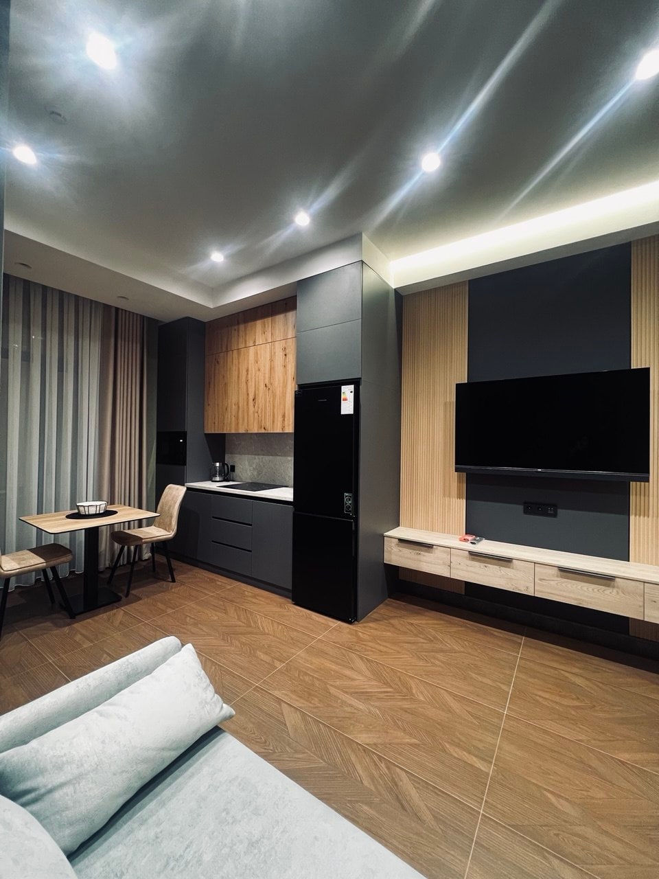 Uživajte u udobnom boravku u studio apartmanu! Sa 30 m2, nudi dovoljno prostora za vaš boravak. Brzi WLAN, uključena klima-uređaj. Potpuno opremljen svim potrebnim uređajima. Udoban krevet širine 1,65m, idealan za jednu osobu i pogodan za malu porodicu. Nova zgrada sa liftom i čuvanim dvorištem. Stan se nalazi na odličnoj lokaciji, samo 15-20 minuta taksijem od centra grada. U neposrednoj blizini ćete pronaći:supermarkete, suši bar,piceriju,restorane sa nacionalnom kuhinjom, prodavnice alkohola.