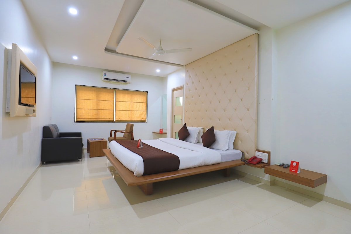 Ova moderna deluks soba nudi udoban bračni krevet, umirujuće osvjetljenje, zavjese do poda i čist drveni dekor. Uživajte u hladnom i opuštajućem boravku uz klima-uređaj, čistu posteljinu i osnovne sadržaje – savršeno za parove, samostalne putnike i poslovne goste u Sajed Vasni, Vadodara.