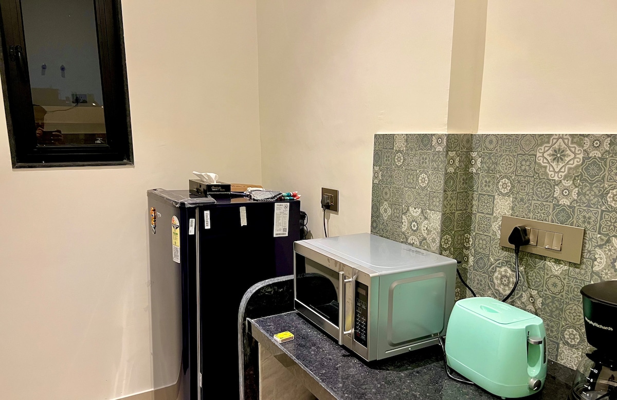 Privatni, mračni 1BHK dizajniran za parove koji cijene privatnost, udobnost i stil. Ovaj apartman sa tamnom temom spaja bogate ugljene i duboke zelene tonove sa toplim osvjetljenjem, stvarajući intiman, butik boravak u Džajpuru. Izađite na privatni balkon i uživajte u umirujućem pogledu na horizont. Stan uključuje potpuno opremljenu modernu kuhinju, snažan klima uređaj, brzi Wi-Fi, idealan za romantične izlete ili mirne odmore.