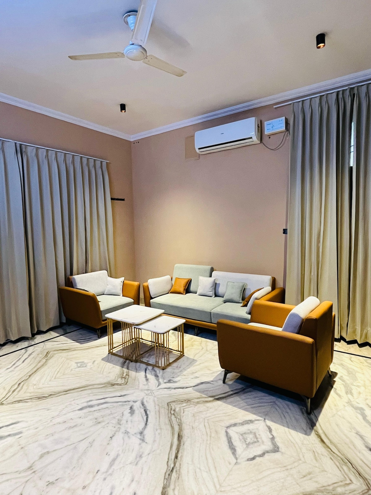 Experience ultimate luxury in this penthouse.Featuring a stylish pool table&elegant bar counter, it offers the perfect blend of leisure&sophistication.The rooftop gazebo opens to a peaceful sitting area surrounded by lush plants&a relaxing swing, creating a private oasis. 3 luxurious bedrooms with attached premium washrooms ensure comfort and privacy. 2 fully equipped kitchens and two spacious halls—one designed for recreation—make this penthouse ideal for premium stays and memorable gatherings.