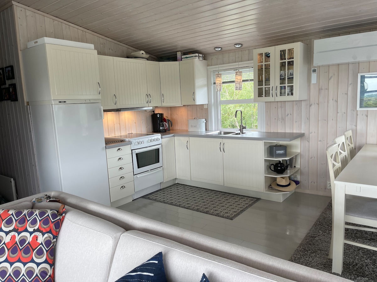 Moderna brvnara 1 sat i 40 minuta od Trondhajma, sa panoramskim pogledom na fjord, Severno more i planine. Spoljašnja hidromasažna kada sa pogledom na zalazak sunca. Kupatilo sa podnim grejanjem, veš mašinom i tušem. Aneks sa sopstvenim kupatilom. Sauna. Mašina za pranje sudova; mikrotalasna rerna. Toplotna pumpa sa SMS-om/unapred ograđena brvnara. Pet minuta hoda do fjorda sa mnogo ribe. Planine i jezera u šetnji. TV (međunarodni kanali). Za parove, porodice ili velike grupe (do 9 ljudi + krevet za bebe).