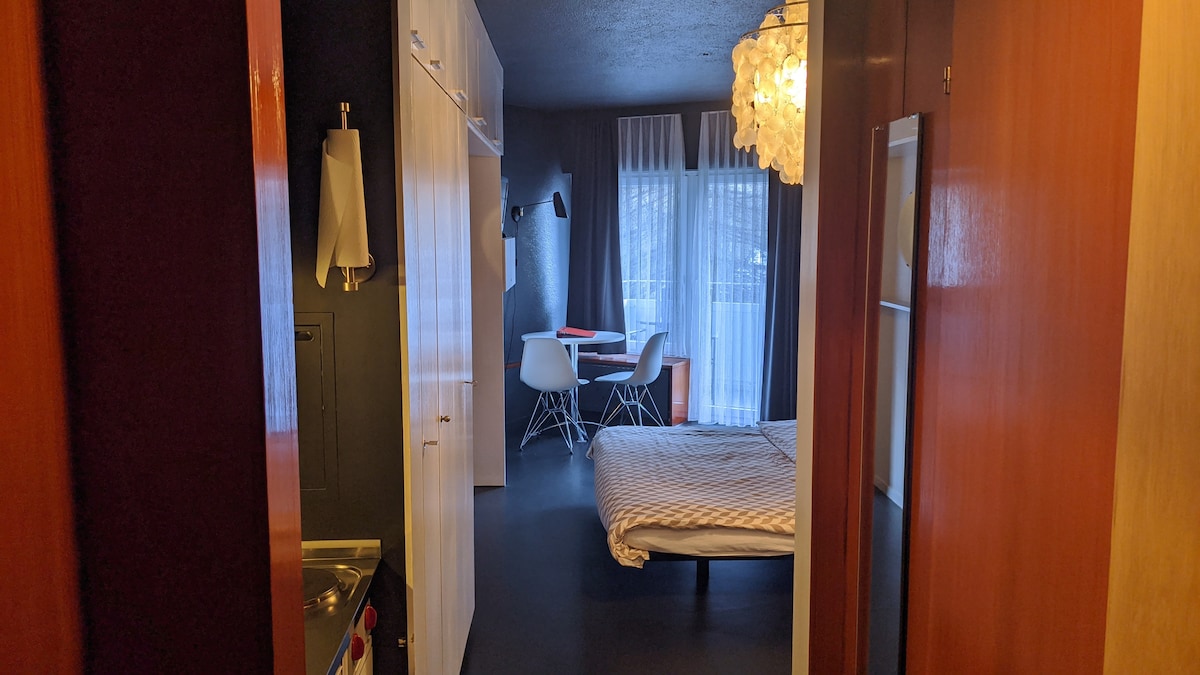 Dear Guest It awaits you a modern, partly renovated, ready-furnished 1.5 room space (approx. 35m2) + secondary storage room in the top floor of a 3-story property with a dedicated stairway (if you are not comfortable with stairs: there is no elevator ;-). The property is beautifully situated on a slope, embedded by green nature. The space radiates a dreamy Scandinavian lightness. The roof-slope adds spaciousness & air to the atmosphere. Here we invite you cordially to relax & enjoy yourselves!