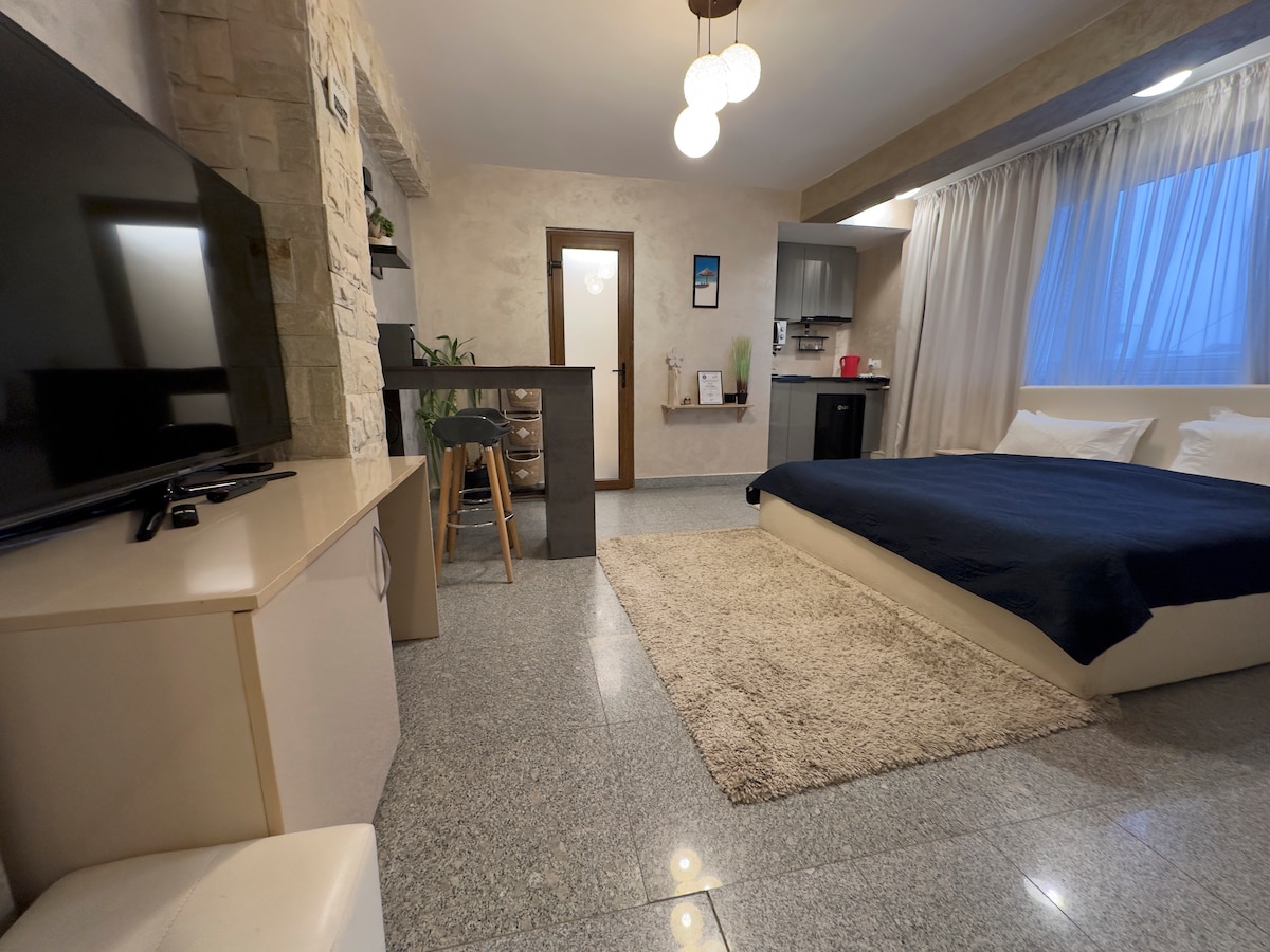 Moderan, udoban studio apartman na samo 5 minuta od plaže 3 Papuci ( zoom plaža). Savršen za parove, ima bračni krevet, klima-uređaj, čajnu kuhinju, TV ravnog ekrana i privatni parking. Idealno se nalazi na glavnom bulevaru, sa jednostavnim pristupom: • Supermarketi (mega slika – 3–5 minuta hoda) • Restorani, kafići i barovi na plaži • Apoteka i medicinski centar u blizini • Javni prevoz i brz pristup centru grada Uživajte u mirnom boravku u blizini mora, sa svime što vam je potrebno za udoban odmor.
