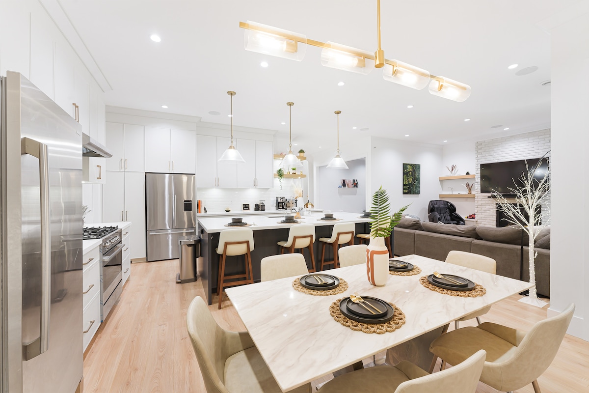 Otkrijte prostrani 4BR/4.5BA smještaj u Vankuveru, savršen za porodice ili veće grupe. Uživajte u bračnom krevetu, tri bračna kreveta (sva sa odvojenim kupatilima), potpuno opremljenoj kuhinji i klima-uređaju. Opustite se na privatnom dvorištu ili uživajte u kafi s pogledom na centar grada koji oduzima dah s terase na krovu sa roštiljem. Smještena na samo 5 minuta hoda od najbližeg SkyTraina i 12 minuta vožnje do centra Vankuvera, ova kuća nudi jednostavan pristup svim gradskim atrakcijama.