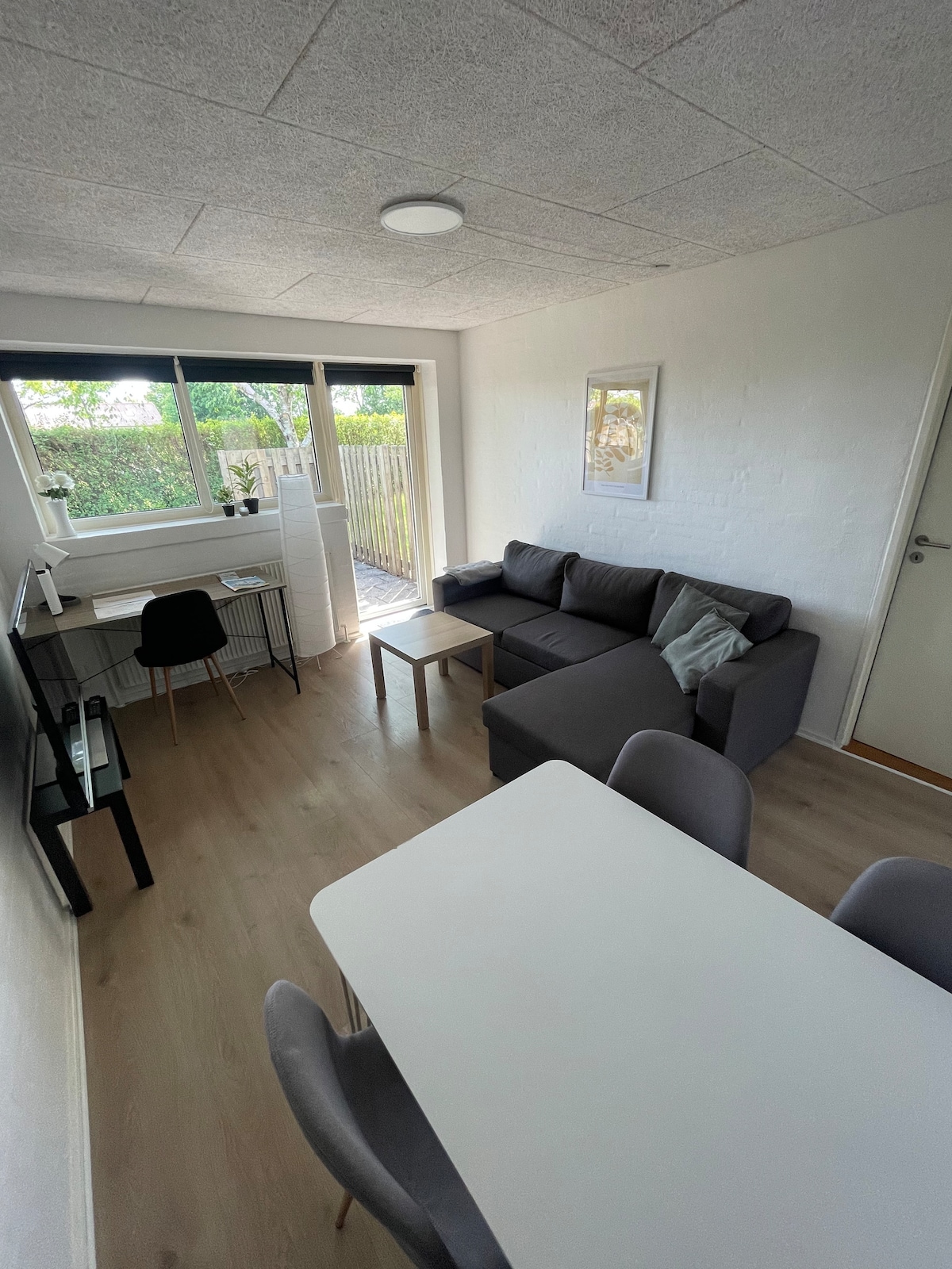 Nyetableret stort værelse i særskilt bygning på landbrugsejendom. Egen indgang. Boligen består af stue/køkken, soveværelse og badeværelse. I alt 30 m2. Alt i lyse og venlige materialer. Der er køleskab, ovn/micro-ovn og induktionskogeplade. Boligen er udstyret med al nødvendig køkkenservice, glas og bestik. Der er mulighed for at låne Chromecast.