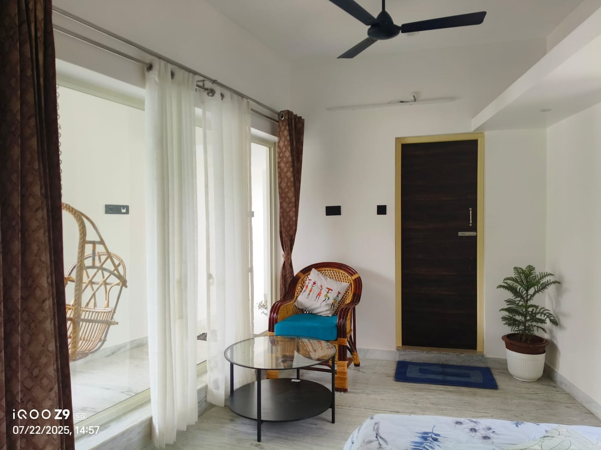 Mirno i prozračno mjesto sadhane i tišina za poklonike Arunahale, u otvorenom i zelenom rasporedu. Pojedinačna velika soba / mini studio apartman sa kuhinjom potpuno namješten na prvom spratu sa otvorenom terasom. To je privatni smeštaj. To je mjesto posebno za one koji se bave meditacijom. Daleko od užurbanog područja ašrama, ali samo 10 minuta biciklom do tamo. Ciklus je uključen. Dom smatramo sam ašramom. Nadamo se da ćete cijeniti ovu atmosferu.