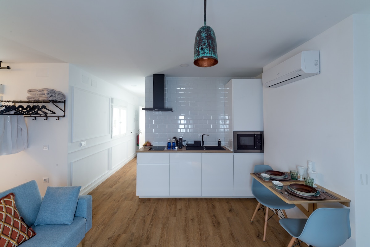 Vrlo svetao i funkcionalan novi loft sa privatnom terasom i privatnim pristupom zgradi. Nalazi se u veoma mirnom stambenom području i u blizini glavne ulice prodavnica. Udaljeni smo pet minuta od starog grada i na 10 minuta od Plaja de los Lances, sa terase se vidi more. Kuhinja i kupatilo su potpuno opremljeni, kompletna kuhinja, peškiri, posteljina i ćebad za četiri osobe. Idealan stan za parove ili do četiri osobe.