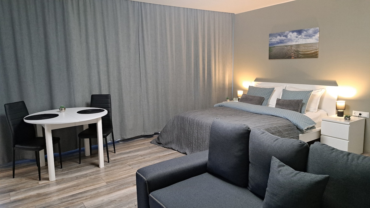 A cozy and bright 45 m² studio in the heart of Pärnu with a view of the Town Hall. Perfect for an winter getaway. Everything is nearby: cafes, shops, and the theater. The apartment features a comfortable bed, a fully equipped kitchen, spacious bathroom, lounge area with a large TV, and excellent Wi-Fi. Free courtyard parking (subject to availability). Ideal for couples and business trips. No parties. Easy self check-in, responsive host