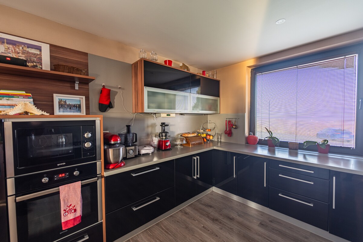 Naša vila sa suncem se nalazi u divnom zelenom pejzažu na vrhu brda sa prekrasnim pogledom na prirodni pejzaž. Dođite i napunite baterije u 3 luksuzne spavaće sobe sa 3 privatna kupatila, osećajte se kao kod kuće u našoj prostranoj kuhinji ili iz snova pored kamina. Ne zaboravite da pogledate gore - drveni plafon star 150 godina svakako zaslužuje i vašu atmosferu. Možete se opustiti u privatnom, hemijskom - besplatnom bazenu, lepim šetnjama ili iznajmljivanju bicikla. To je zaista radost koju bismo želeli da podelimo sa vama