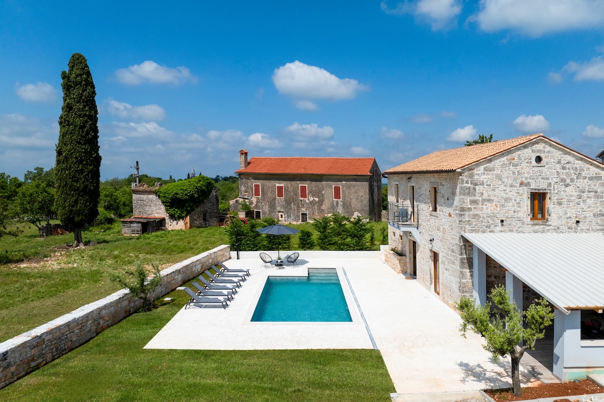 Elegantna vila u blizini Rovinja sa bazenom vrednim fotografisanja, hidromasažnom kadom i saunom. Probudite se uz bujne, panoramske poglede na dolinu. Pogodno za parove i porodice, kratka vožnja do avanturističkog parka, Nacionalnog parka Brioni, dinoparka, srednjovekovnih gradova i lokalne kuhinje. To je pravi zeleni odmor za svakoga ko želi da se vrati prirodi sa svom udobnošću modernog života. Potpuno opremljen za kuvanje i zabavu na 2600 m2 bašte (fudbal, brza lopta, badminton i zabava u bazenu) za uživanje vaše djece i najmilijih.