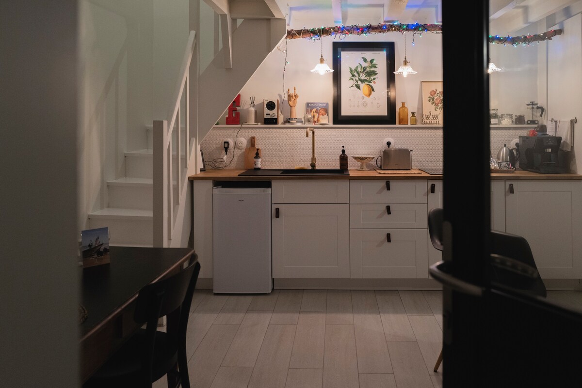 Venez vous ressourcer dans une atmosphère chic et contemporaine. ------------------------------- Tout est prévu afin que vous passiez un moment inoubliable avec des attentions particulières. ----------------------------- Au sous sol, une cave voûtée du XVe siècle a été spécialement aménagée en salle de cinéma avec un son immersif. Éclairage d’ambiance sans oublier un grand lit type hotel pour une expérience unique. ------------------------------ Place de stationnement privée à 5 minutes à pied.