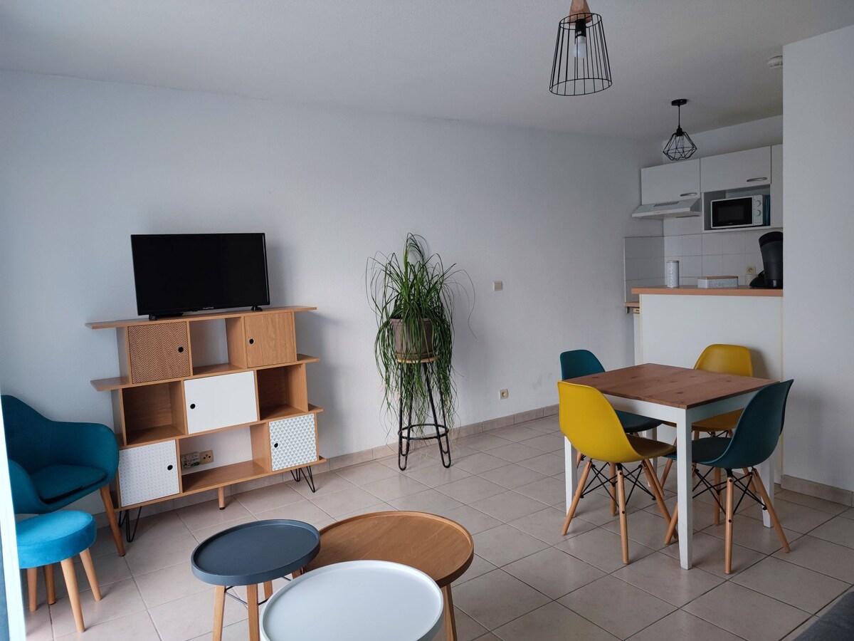 Accommodation located in a quiet residential area just five minutes from Carcassonne. Our cozy retreat can accommodate one to four guests in a peaceful setting. It features a private entrance, a private terrace, and free, secure parking visible directly from the accommodation, offering real peace of mind. Comfortably equipped, it provides a warm and functional atmosphere, ideal for a tourist, business, or relaxing stay.