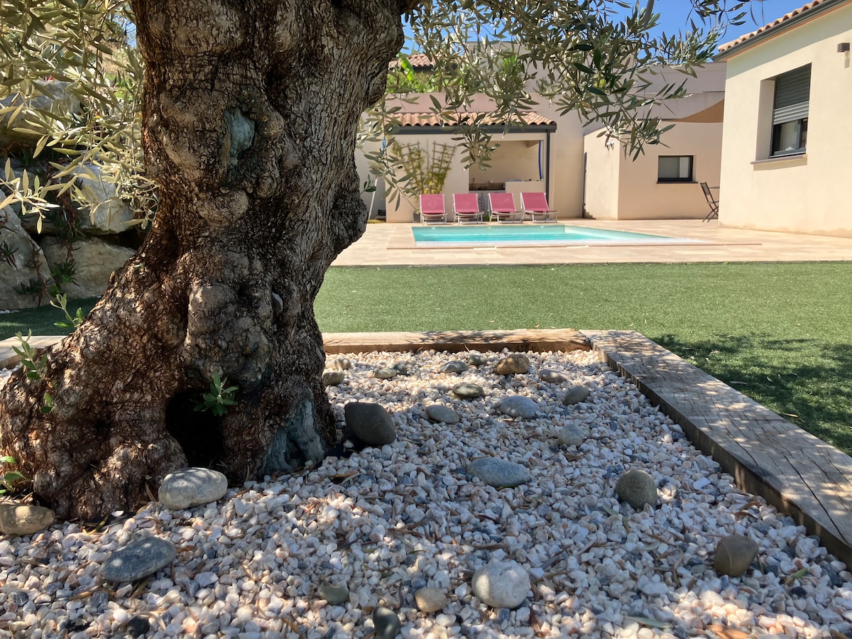 U srcu vinograda, Bastide des Vignes je šarmantna kuća idealna za smještaj do 8 osoba u mirnom i prirodnom okruženju. Nudi 4 spavaće sobe, 3 kupatila, svijetao dnevni boravak i potpuno opremljenu kuhinju. Kuća je klimatizovana i grijana tokom cijele godine, a izlazi na ograđenu baštu površine 1.500 m² sa privatnim bazenom, savršenu za opuštanje i uživanje u slasti života na jugu Francuske.