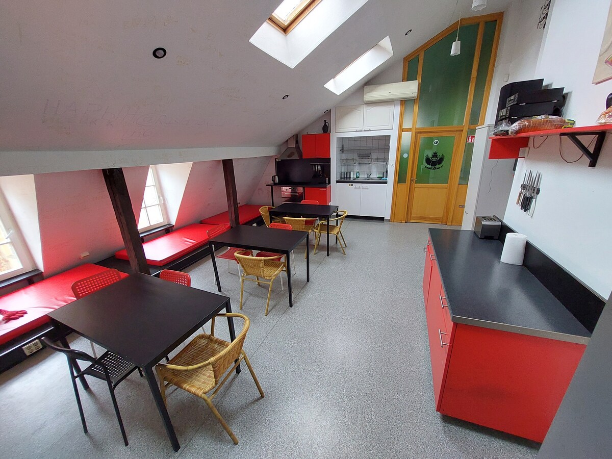 Jednokrevetna soba sa krevetom za jednu osobu, zajedničkim tušem/WC šoljom i mnogo zajedničkih prostorija za sve.