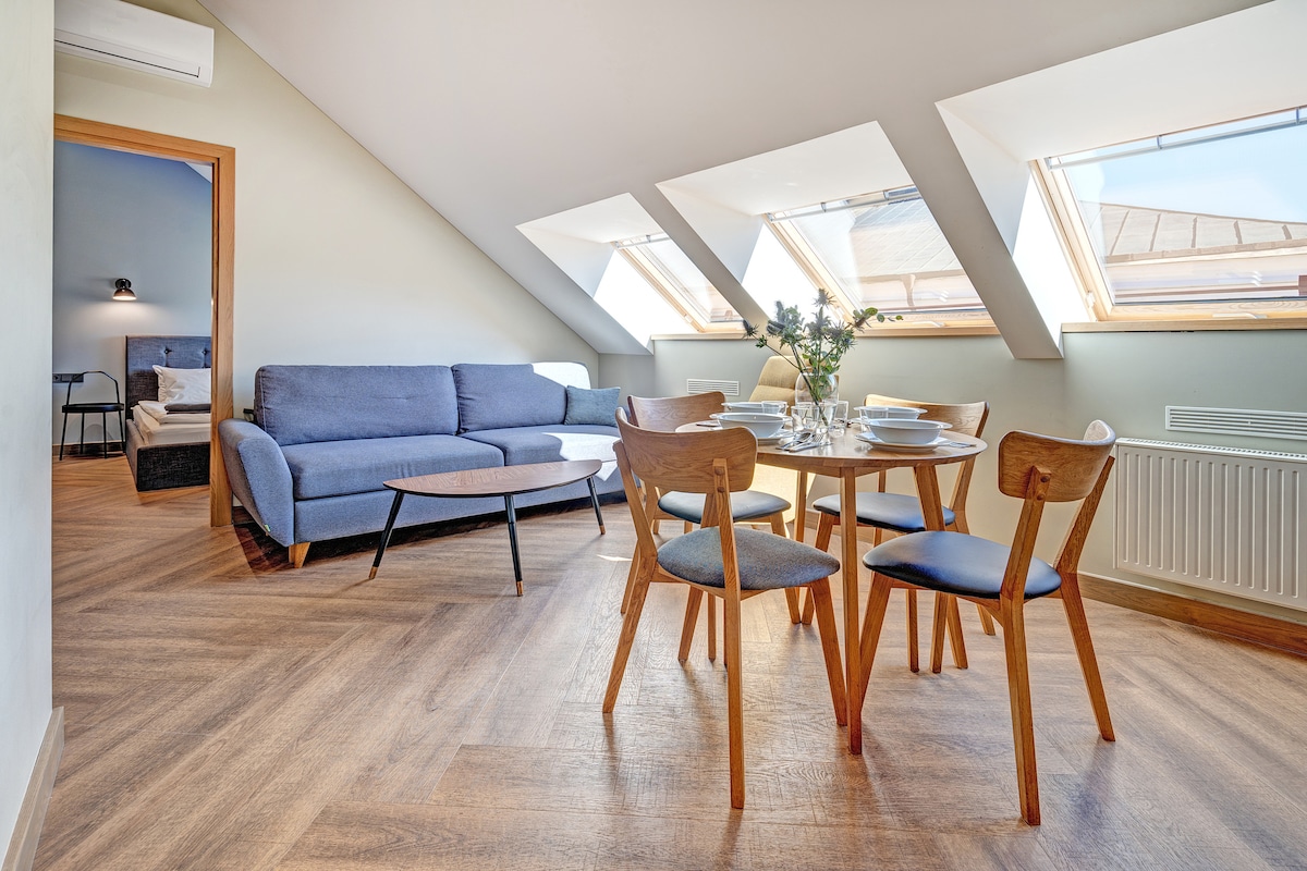 U jedinstvenom apartmanu od 48 kvm naći ćete dva kreveta kraljevske veličine, internet, klima uređaj, odličan tuš, potpuno opremljenu kuhinju i 4 radna mesta (2 stola + 2 police). U samom srcu starog grada Vilnjusa imaćete priliku da osetite pravi istorijski dah prošlosti dodirujući 500 godina stare drvene grede, gotičke cigle, gips i artefakte. U krugu od 300 metara naći ćete 33 restorana, 2 supermarketa, 5 muzeja i 12 crkava! Nećete zažaliti - ovo je zaista čarobno mesto!