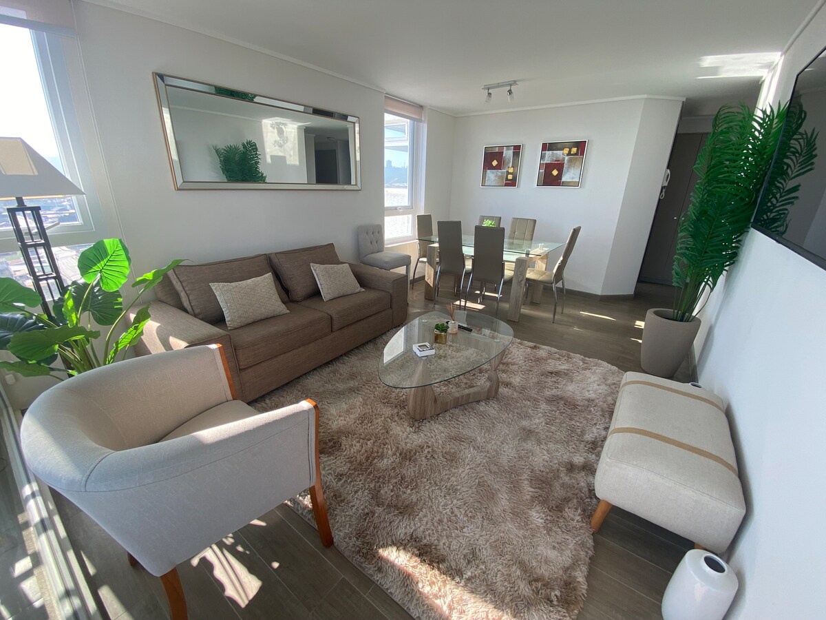 5* Viña/Valparaiso: PONUDA ZA JESENSKU SEZONU!SPEKTAKULARAN POGLED, POTPUNO OPREMLJEN, PARKING, TERETANA, PANORAMSKA TERASA, PERIONICA VEŠA. Ljeti je na otvorenom bazenu s prethodnom rezervacijom. Najbolji odnos cijene i kvaliteta! Prelijepa, udobna, prijatna. OSEĆAĆETE SE KAO KOD KUĆE! Više od smeštaja, to je panorama koja se nalazi tamo: svijetla, u mirnom i stambenom okruženju. Prevoz udaljen pola bloka, pegla, smartTV, fen za kosu, namešteni kreveti, bluetooth zvučnik, sokovnik, rerne, aparat za kafu, so, šećer, čaj, kafa i još mnogo toga.
