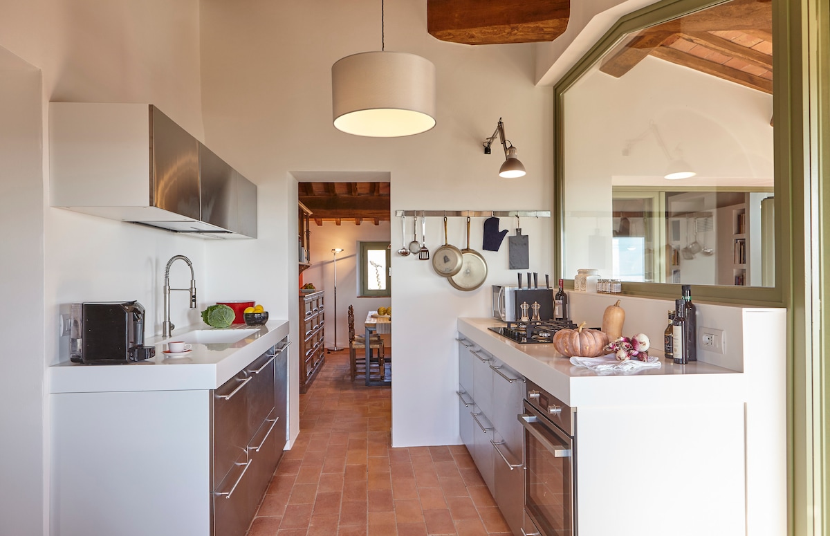 Ogroman i šarmantan stan na posljednjem spratu u toskanskoj vili sa pogledom koji oduzima dah! Posjetite Montepulćano, Piencu, Sijenu, istražite seosku stranu, vinograde i termalne izvore, planinarenje ili e-biciklizam, šetnju ili vožnju! Dva prostrana apartmana sa krevetima vrhunskog kvaliteta i kupatilom sa spojenim kupatilom. Dnevna soba sa zidovima na prozorima, udobni kauči, profesionalna kuhinja za sopstvenu upotrebu. Možemo da organizujemo posetu vinariji i degustaciju, časove kuvanja i privatne večere. NOVA hidromasažna kada okrenuta prema zelenom vrhu brda! Doživite Toskanu kao mještanin, u društvu lokalnog domaćina!